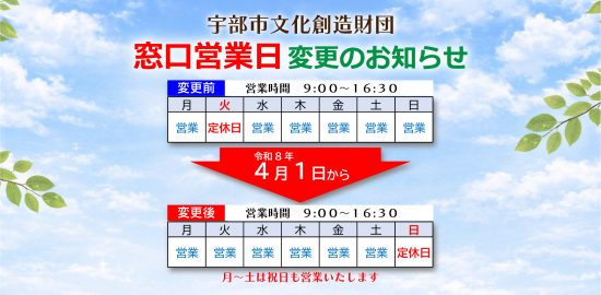 平素より、宇部市文化創造財団事業の推進に、ご理解とご協力を賜り、誠にありがとうございます。令和8年4月1日より、チケット販売を含む窓口営業日を下記の通りに変更いたします。皆さまにはご不便をお掛けいたしますが、何卒ご理解くださ…