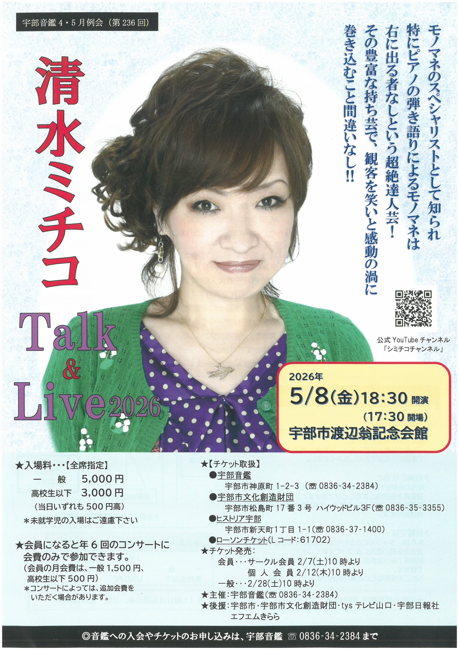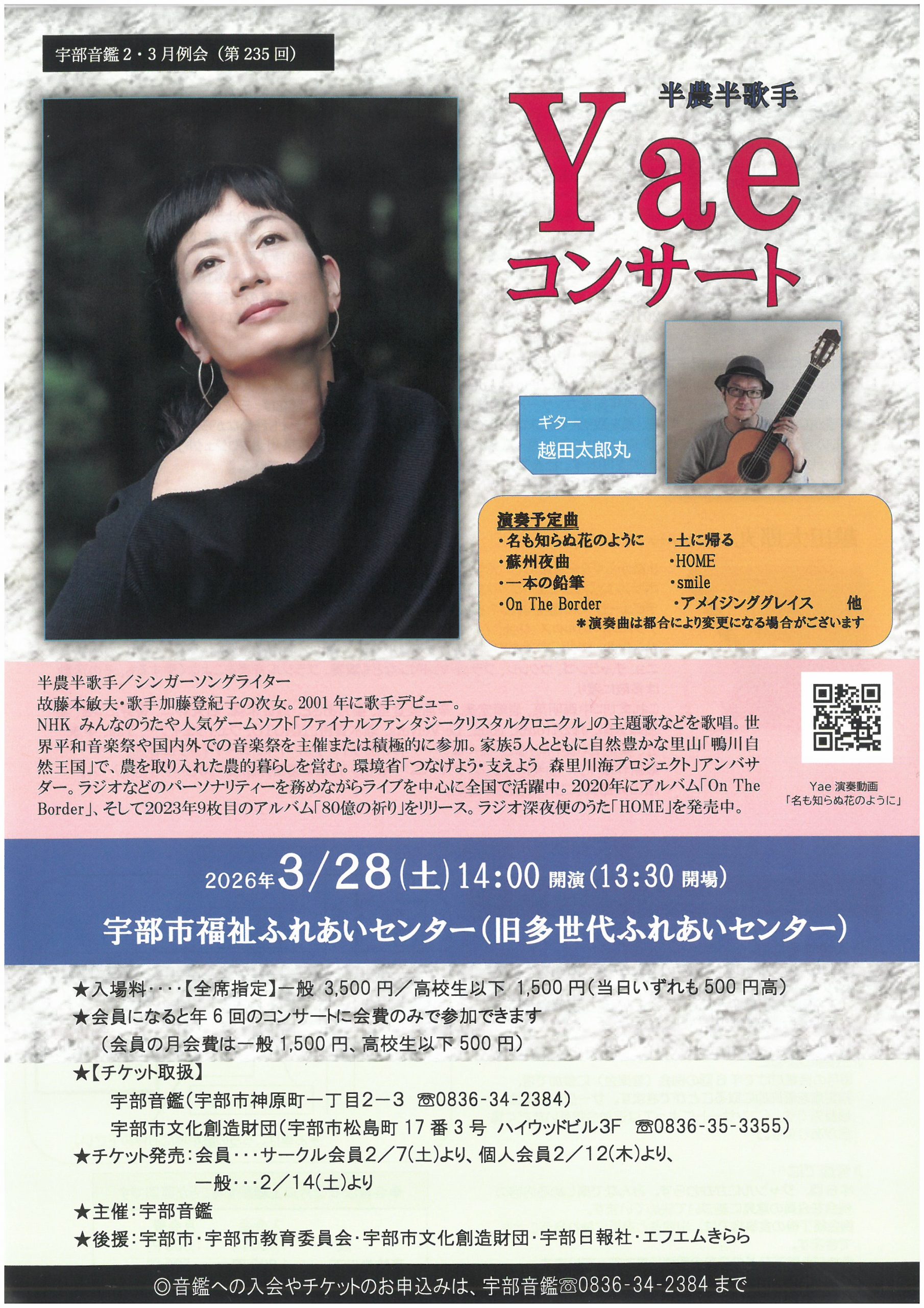 | 主催・問合せ先 | 主催:宇部好楽協会 予約:問合せ:宇部市文化創造財団 TEL:0836-31-7373 (9:00~16:30 火曜定休) |