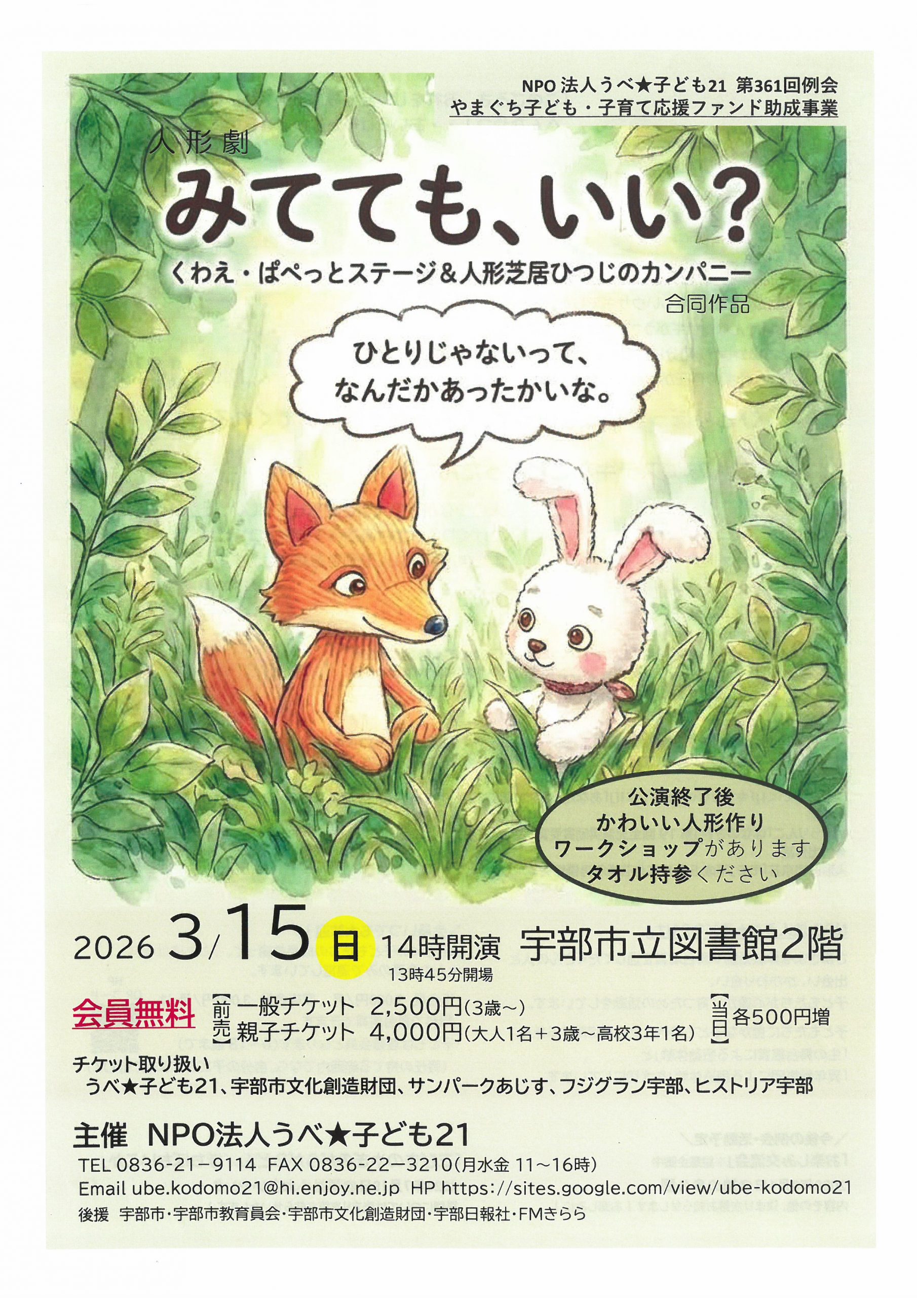 | 料 金 | 【全席指定】 一般 1,000円 高校生以下 500円 ※障がい者に同伴する介助者は1名まで無料 (介助者のチケット取り扱いは宇部市文化創造財団のみ) ※未就学児の入場はご遠慮下さい |